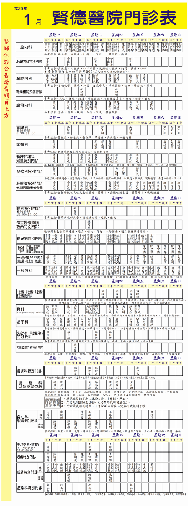 本表僅提供參考,若醫師臨時請假,未能應診者,將安排其他醫師代理,特此聲明,敬請見諒!