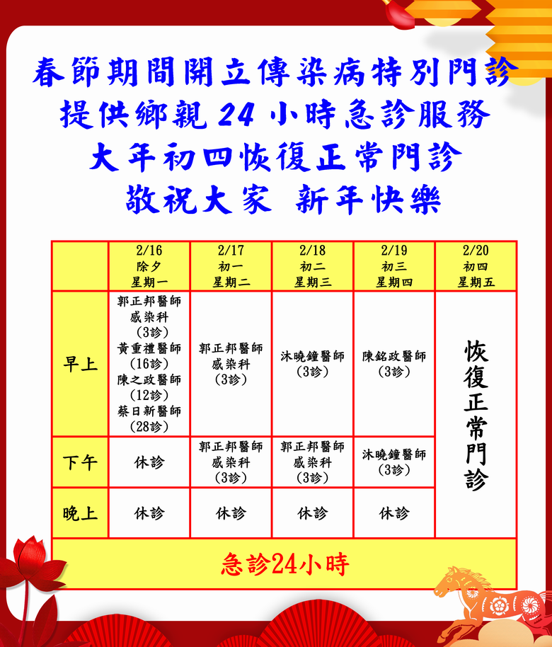 *2月16日(一)早上休診:潘彥宇醫師、王瑋璨醫師、宇忠誠醫師
